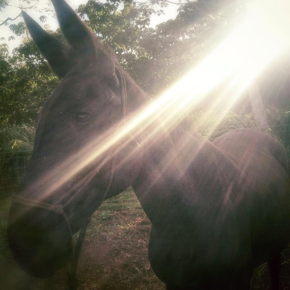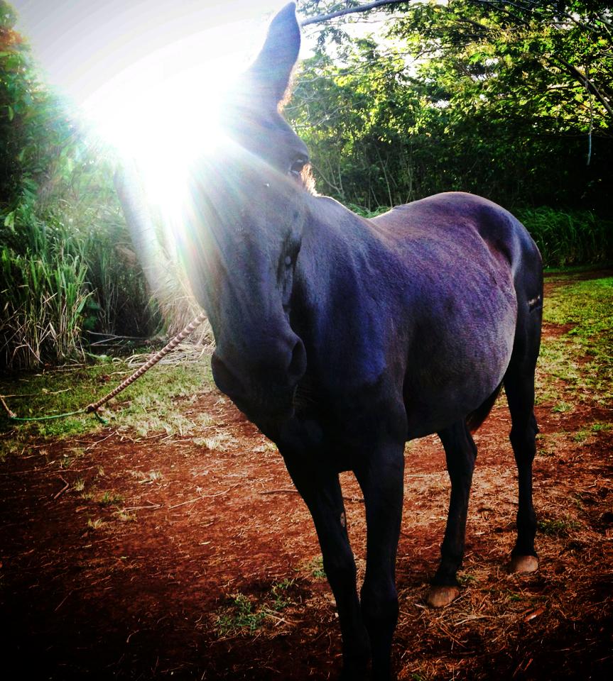 Lanipō is our dear sweet mule. She works hard, always helping us- opening pathways, clearing weeds, moving logs, mowing the lawn, guarding the garden, taking us places, encouraging curiosity, serious steadfast silliness, very large cuddles, and she fertilizes plenty…
